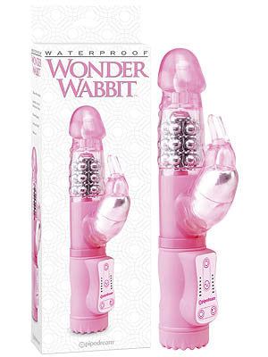 Get pleasure hopping with the Waterproof Wonder Wabbit Vibe! This premium dual-action vibrator is made from phthalate-free TPE and features 3 rows of spinning metal beads that massage and automatically reverse directions. Carefully bend the shaft to increase the rotation of the shaft, press the rotation power button, then choose a speed from the easy push-button controls. The smooth, flexible shaft squirms and rotates at six thrilling speeds, while the spinning pleasure pearls massage and change directions on the fly. Now, press the power button to activate the rabbit-shaped clit stimulator, choose a speed, and enjoy six more speeds of orgasmic clitoral stimulation simultaneously!