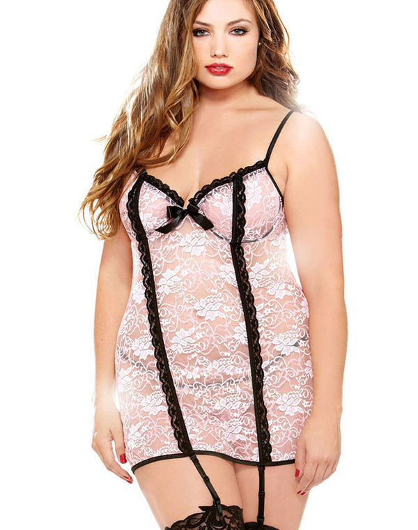Blush lace chemise and matching g string. With adjustable straps. Black bow and black piping trim front. Keyhole cut out back. Attatched garter straps and matching g string. Stockings not included