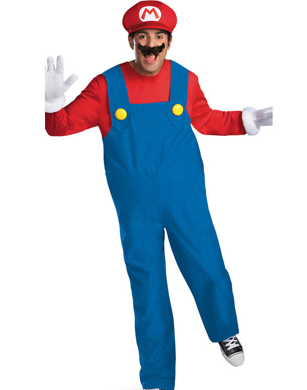 Includes blue jumpsuit with yellow buttons, hat with M print, faux mustache and white gloves