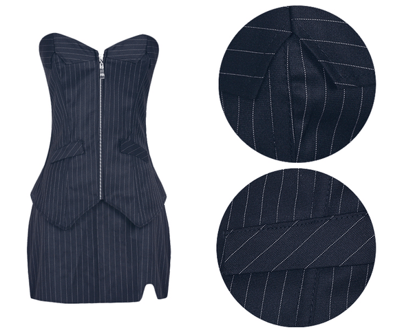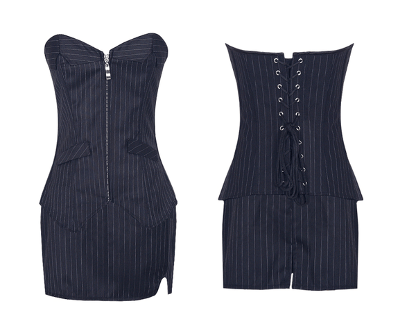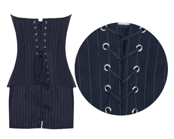 "Ella" is a classic yet sexy 3-Piece sexy office corset featuring a front zipper, lace up back with mini skirt and BONUS g-string.