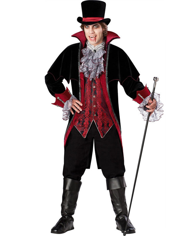 6pc Vampire of versailles costume includes a long velvet coat with attached capelet and lace sleeves, the red and black brocade vest, velvet pirate shorts pants, the vampire of versailles mens halloween costume also has hat and boot covers